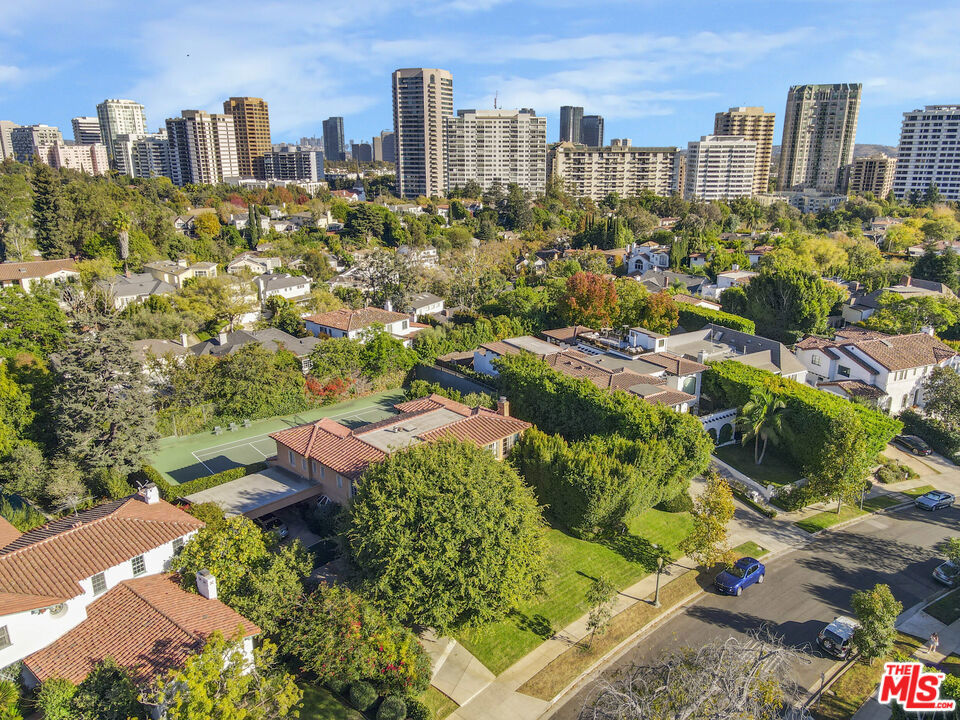 Extraordinary Tennis Court Property rarely found in the highly regarded area of prestigious Little Holmby! This exceptional Mediterranean residence is sited on an unusually grand amount of land…just under 20,000 square feet across two distinct, flat parcels. Its timeless elegance and prime location represent a significant opportunity for discerning buyers seeking a very distinguished home. Upon entry, one is welcomed by a grand foyer and an impressive sweeping staircase. The gourmet kitchen is equipped with a central peninsula, a Sub-Zero refrigerator, double ovens and a warming oven, all of which connect seamlessly to a sunlit breakfast/family room. Expansive floor-to-ceiling windows in this area provide a view of a very rarely found north-south tennis court. The living room, designed for gracious entertaining, features a gas burning fireplace and architecturally-appealing arched windows with wooden shutters. The formal dining room offers picturesque views of lush greenery. The large, yet cozy, informal den/library is ideal for quiet time or for enjoying your favorite television shows. A bedroom and bath off the kitchen area and a powder bath off the foyer complete the downstairs floorplan. Upstairs, there are four spacious bedrooms including the very private primary suite. It includes a luxurious bath complete with dual sinks, a spa tub, separate shower and a vast walk-in closet. Additional amenities of this expansive and secluded property include dual zone A/C, red oak hardwood flooring and custom carpeting. The outdoor space features a tennis court, a private swimming pool and a spa complete with exercise jets as well. There’s a brick-clad patio right off the kitchen complete with a barbecue area, perfect for outdoor dining, lounging and cheering on the tennis game…the ideal spot for enjoying California’s relaxed indoor/outdoor lifestyle. Close proximity to UCLA, Westwood Village, Beverly Hills, Century City and Santa Monica and to all the shopping and dining each area affords. Also, this special property feeds into the very-well-regarded Warner Avenue Elementary District. Here’s a unique opportunity for those seeking a refined and luxurious experience. This property includes APNs 4360-013-008 and 4360-013-009. Public records shows 4,071 interior square footage and another professional measurement shows 4,342 interior square footage. Neither Seller nor Brokers nor their Agents make any representation as to either number’s accuracy. Floorplans are in “DOCS”