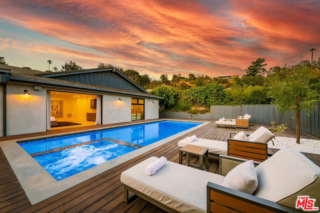 Stunning Mid-Century Modern farmhouse with seamless 6,500 Sq. ft. of indoor/outdoor living. This brand new remodeled home is located on a quiet cul-de-sac in prime Trousdale Estates in Beverly Hills. The 1st floor offers a beautiful, bright open floor plan w/ high ceilings at the entry, recessed lighting throughout, and hardwood & tile flooring. A gourmet kitchen w/ high-end appliances opens to a private, grassy patio. A dual-sided fireplace centers the living room & family room, leading to a magnificent, private backyard w/ pool, sun deck, & fire pit lounge. The backyard features lush landscaping w/ mature, architectural trees & complete privacy. The 2nd floor has an expansive entertainment room with a patio overlooking majestic views! There is a 5th bedroom/ office on the 2nd-floor w/ full bath & wet bar. This beautiful property has its own unique touches, and meticulous attention to detail, and is the quintessential example of California Indoor/Outdoor living. Available for long term rentals and/or short term rentals with flexible lease terms.