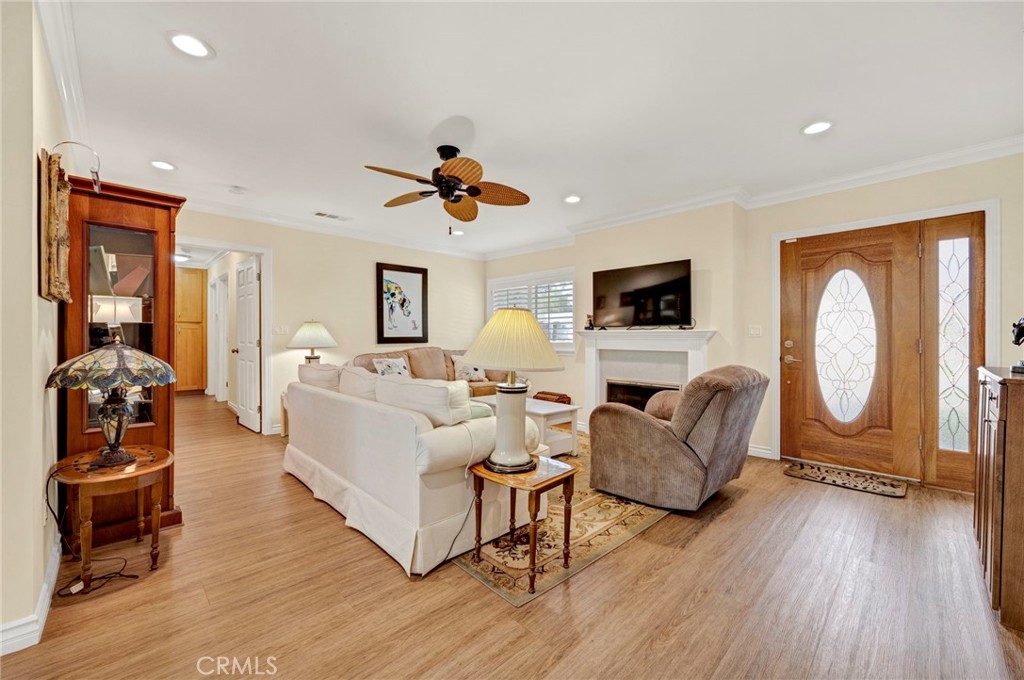Discover this breathtaking home on a peaceful cul-de-sac in one of Monrovia’s most sought-after neighborhoods. As you arrive, a stylish and new paved driveway welcomes you to the home. Step inside to experience the open-concept layout that creates a lasting first impression. The cozy living room with a gas fireplace sets the tone for comfort and warmth. Down the hallway, two well-appointed bedrooms and a fully remodeled bathroom offer space and style, along with a convenient laundry closet with a newer washer and dryer. The expansive gourmet kitchen is a chef’s dream, showcasing solid wood cabinetry with soft-close drawers, stainless steel appliances, and abundant counter space. The kitchen seamlessly flows into the spacious family room, featuring an electric fireplace and three 8-foot sliding glass doors open to the private yard. The family room is bathed in natural light, making it perfect for gatherings and entertaining. The luxurious primary suite is a true retreat, offering his-and-her walk-in closets, a spa-like private bathroom with a jetted soaking tub, and sliding glass doors that lead to a sparkling pool. The backyard is your private oasis, with a sparkling pool with a heater for year-round enjoyment, thoughtfully landscaped with green grass, and ample space for pool parties and entertaining. Upgrades completed in 2015 include electrical, copper plumbing, a new roof, a new sewer line, double-pane windows with plantation shutters, interior walls insulated with R15, attic insulated with R20, and a tankless water heater. Recessed lighting, ceiling fans, crown molding, and vinyl wood grain flooring, elevate every room’s design. Situated near the Monrovia and Arcadia border, this home is moments away from Restaurant Row, Santa Anita Racetrack, downtown Monrovia, shopping, and the 210 freeway. Welcome Home!