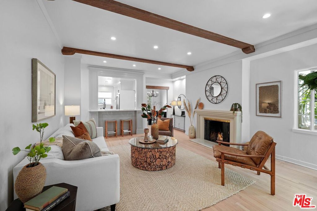 Discover the allure of classic 1930s Old Hollywood charm seamlessly blended with modern conveniences in this rare two-story townhome located in the heart of Beverly Hills. With two bedrooms and one and a half bathrooms, this meticulously renovated residence offers just under 1,400 sq ft of elegant living space. The main floor welcomes you with a living room featuring newly renovated hardwood floors, a cozy fireplace with a classic mantle, and abundant natural light, highlighted by exposed wood beam ceilings. The elegant dining room showcases a beautifully crafted ceiling with rich wood planks, creating a warm, inviting atmosphere that perfectly complements the sophisticated decor. The modern kitchen is a chef’s dream, featuring brand new stainless steel Caf appliances, including a French-door refrigerator with an internal water dispenser and a freezer drawer, a built-in microwave drawer oven, a stainless steel dishwasher, and a smart gas commercial-style range with six burners. The kitchen also offers a breakfast bar and a separate laundry area with a frontload LG washer and dryer. A convenient powder room is available for guests downstairs. Upstairs, you’ll find two spacious bedrooms and a beautifully appointed bathroom. The primary bedroom features French doors leading to a private deck, perfect for relaxing or entertaining. The bathroom is elegantly designed with exquisite tile floors, quartz countertops, and a separate tub and shower. Additional features include recessed lighting, central air and heat with Google Nest smart thermostats on each floor, and one private garage with remote control access. Ample storage areas and linen closets are thoughtfully placed throughout the home. Enjoy the shared private brick patio for dining al fresco. Located just moments away from iconic landmarks such as Rodeo Drive, Beverly Gardens Park, Saks Fifth Avenue, and the historic Beverly Hills Hotel, this townhome offers a rare opportunity to live in one of the most coveted areas of Beverly Hills. Experience the perfect blend of historic charm and modern luxury in this exceptional residence.