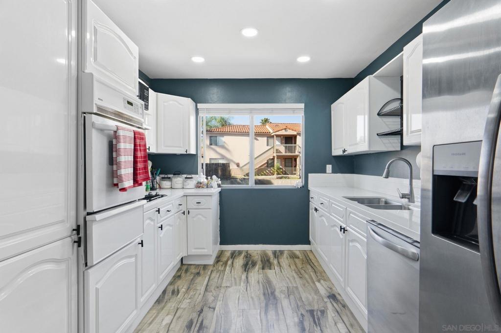 Beautifully upgraded two bedroom condo with newer kitchen, floors, paint, tile and tile. Property features light and bright kitchen with stainless steel appliances, spacious bedrooms, and a large living room. Property is privately located in the complex. The community features lots of green space, a sparkling pool and community laundry facility. Unit has an assigned carport. Conveniently located blocks from shopping and food with ease of access to freeway 52 & 67.