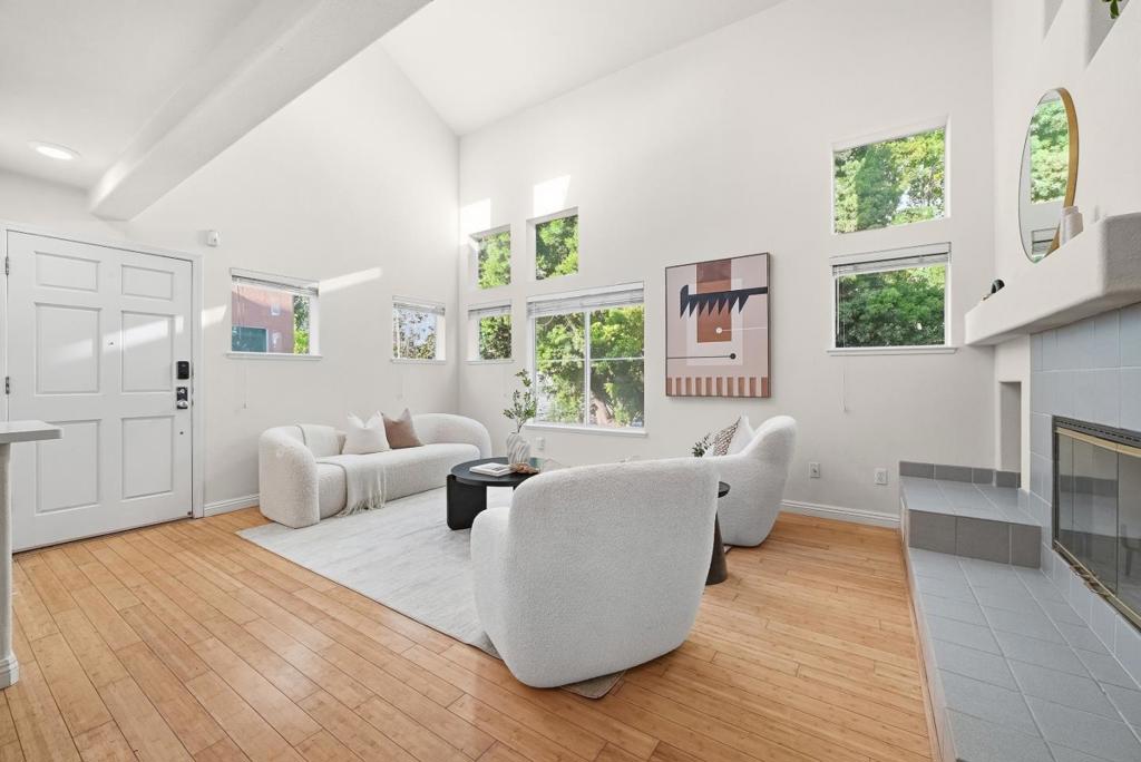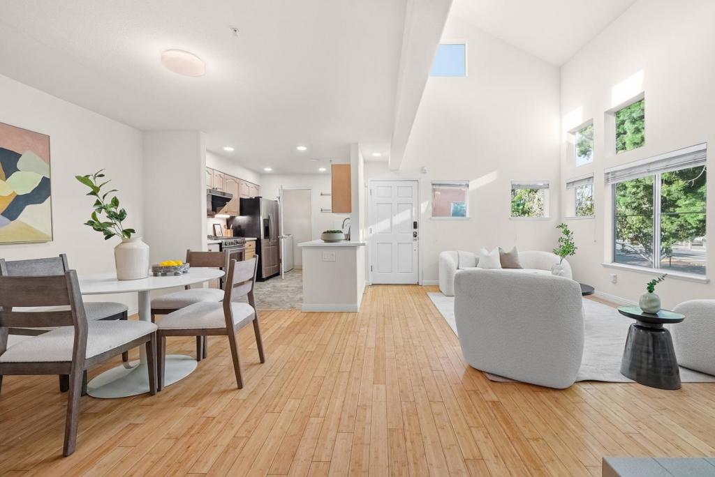 Beautiful two-story Expressions townhouse-style home featuring 2 spacious primary suites, 2.5 baths, a den, and approximately 1,584 sq ft of living space, plus a large private balcony. Dramatic high ceilings create an open and airy atmosphere, while the living room offers a cozy fireplace for added warmth and charm. The kitchen is equipped with stainless steel appliances, including a gas range, and the home also features interior laundry, central heating and air conditioning, premium bamboo flooring, new bedroom flooring, and updated stairs. Enjoy the convenience of an oversized side-by-side 2-car garage.Ideally located in the heart of Silicon Valley, the community offers resort-style amenities including a pool, spa, clubhouse, playground, and BBQ area, with HOA covering water. Excellent location close to schools, parks, shopping, major tech companies, downtown Sunnyvale, Highways 237, 85, 101, and Caltrain.